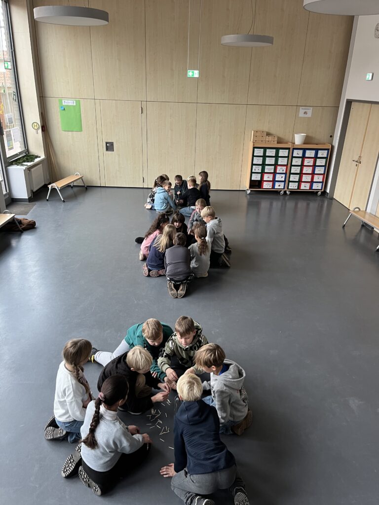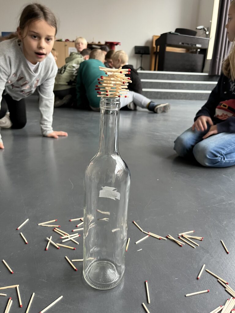 Diesen Dienstag, am 2. Dezember, fand ein Kleingruppenspiel statt. Die Aufgabe war dabei klar und verständlich, brachte aber einige herausfordernde Situationen mit sich. Das Spiel „Streichholzstapeln“ auf einer Wasserflasche setzte eine gute Kommunikation der Kinder voraus. Rücksichtnahme, Ruhe und langsame Bewegungen waren gefragt.