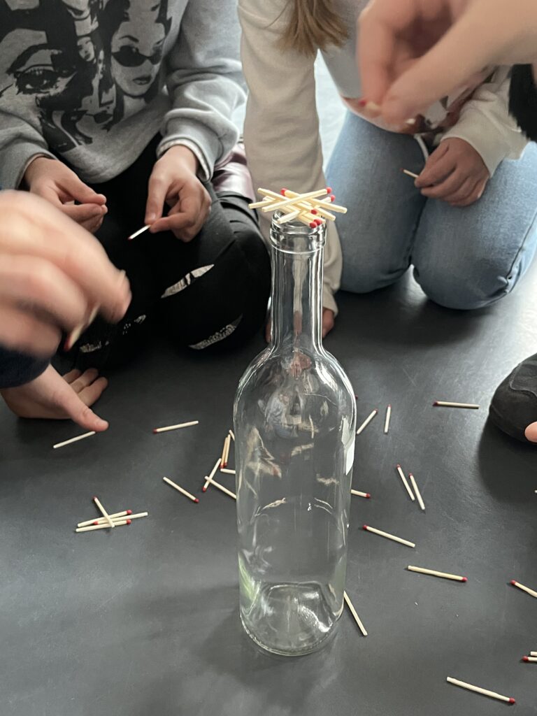 Am Ende schaffte es eine Gruppe, innerhalb von 7 Minuten 40 Streichhölzer auf dem Flaschenhals zu stapeln. Die anderen Gruppen folgten mit 34 und 36 Streichhölzern knapp dahinter. Ein cooles Spiel und eine lustige Erfahrung für alle Kinder!