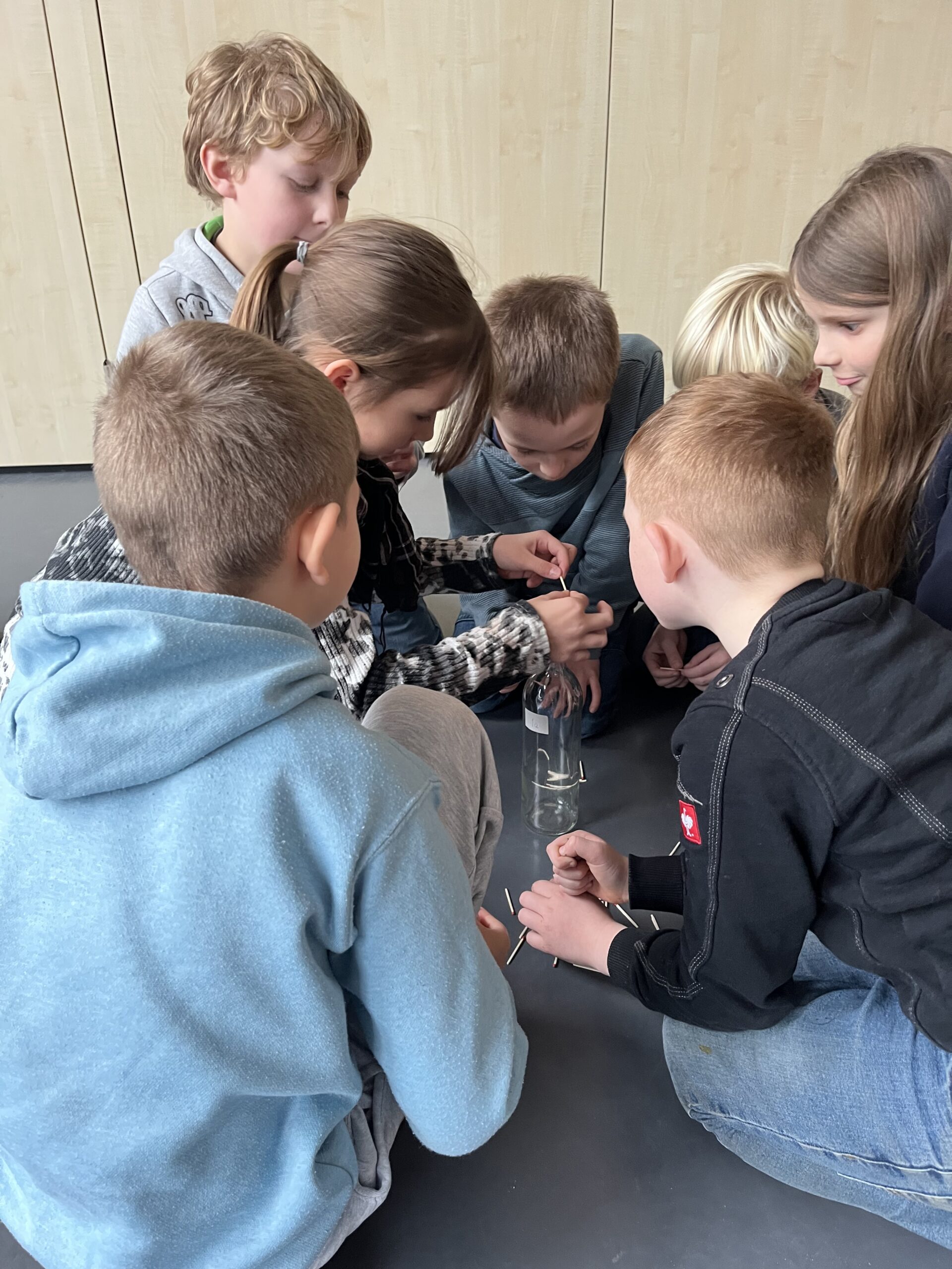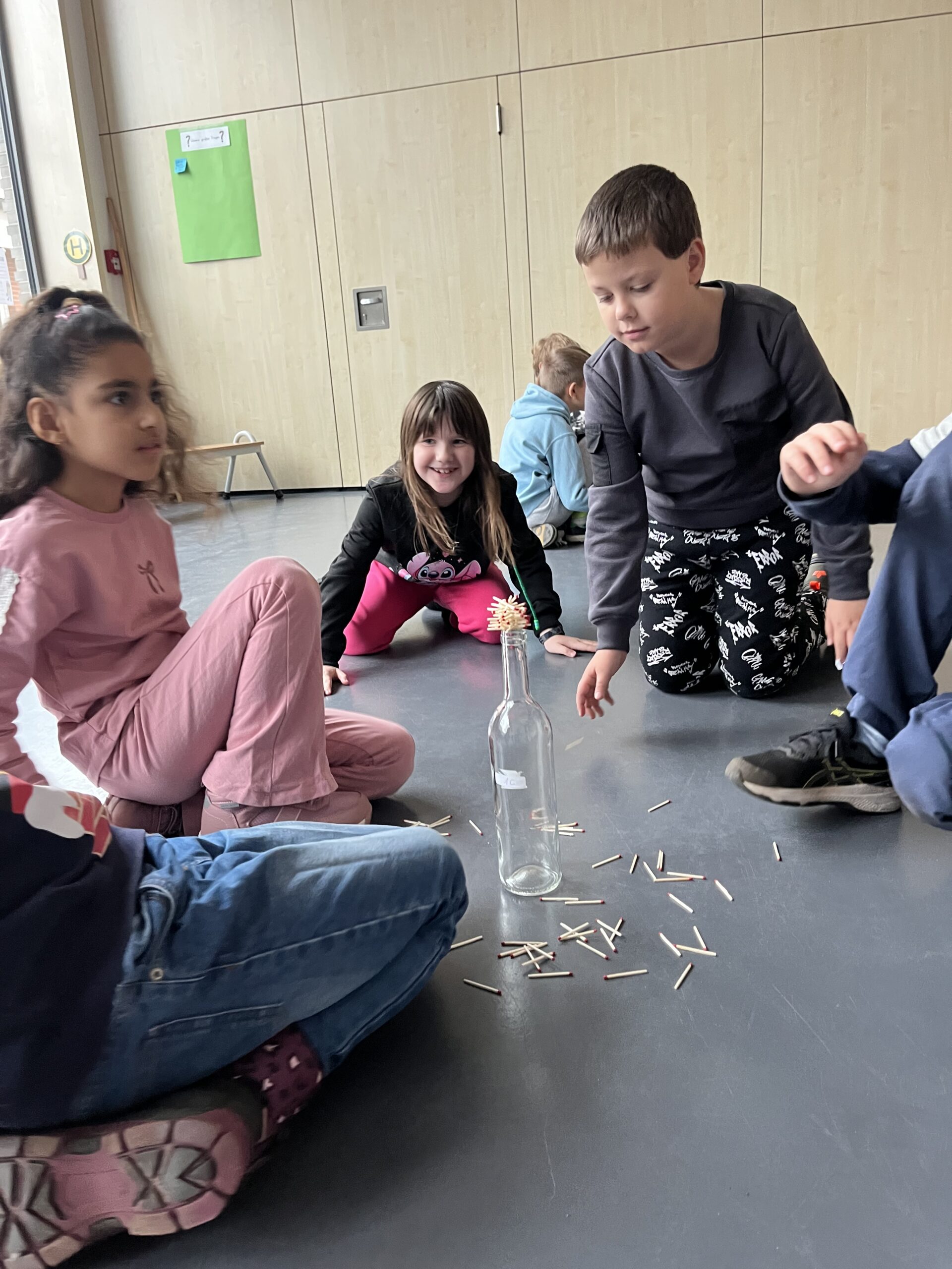 Am Ende schaffte es eine Gruppe, innerhalb von 7 Minuten 40 Streichhölzer auf dem Flaschenhals zu stapeln. Die anderen Gruppen folgten mit 34 und 36 Streichhölzern knapp dahinter. Ein cooles Spiel und eine lustige Erfahrung für alle Kinder!
