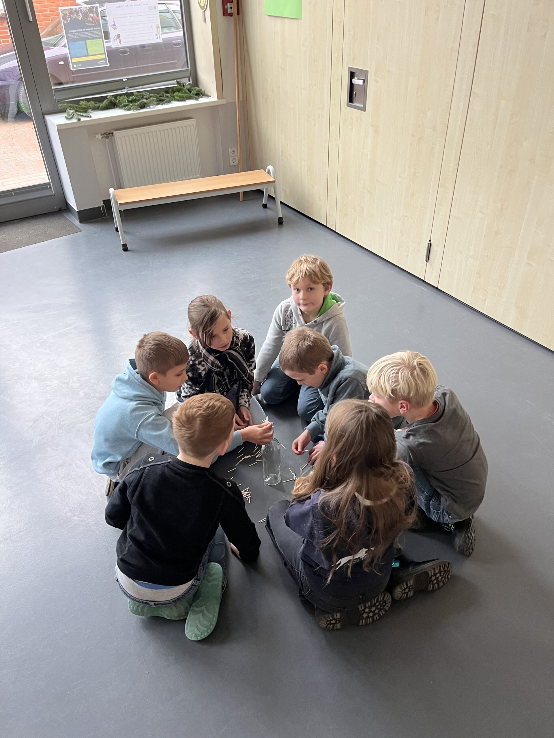 Diesen Dienstag, am 2. Dezember, fand ein Kleingruppenspiel statt. Die Aufgabe war dabei klar und verständlich, brachte aber einige herausfordernde Situationen mit sich. Das Spiel „Streichholzstapeln“ auf einer Wasserflasche setzte eine gute Kommunikation der Kinder voraus. Rücksichtnahme, Ruhe und langsame Bewegungen waren gefragt.